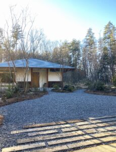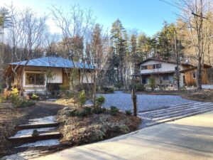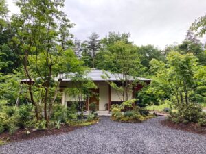八ヶ岳一の棟梁が手がけた、均等の取れた佇まいの家。 庭の素材には山梨県内の瓦生産地から黒瓦を破砕してもらい、庭に敷き入れました。地域の打ち捨てられた植木畑で見つけた、野趣溢れる百日紅の夫婦や庭木たちを招き入れるなど。地域に眠る素材を最大限に活かすべく、施主様の若旦那と作庭衆が一丸となり問答しながら作り上げた庭です。 土中環境の改善を主眼に土木施工しています。