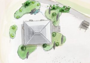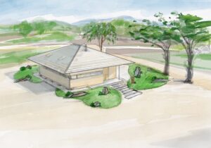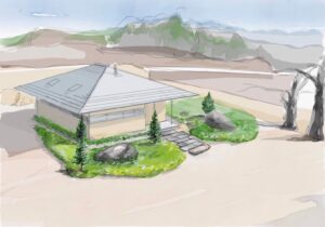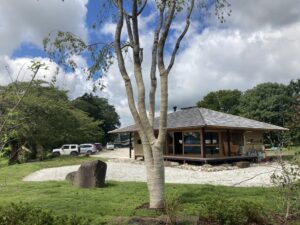 杣か八ヶ岳の木々を中心に手刻みによる建築集団の庭。かつては小学校だった園庭に、過去から突如あらわれたような板葺き屋根のたてもの。10tを優に超える石材を四方に組みました。土地との調和を意識した作庭を目指しました。