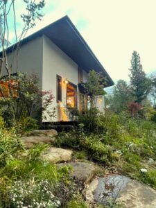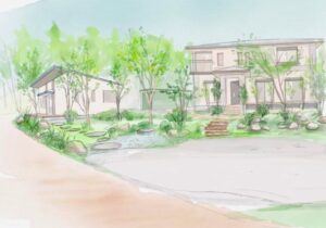 建物正面には、半自然型植生として採草放牧地など人と自然のかかわりのなかで成立する自然な野山を目指しました。ギャラリーの水源は地下水を利用しており、庭にはつくばいを転用した湧き出しを配置しました。
