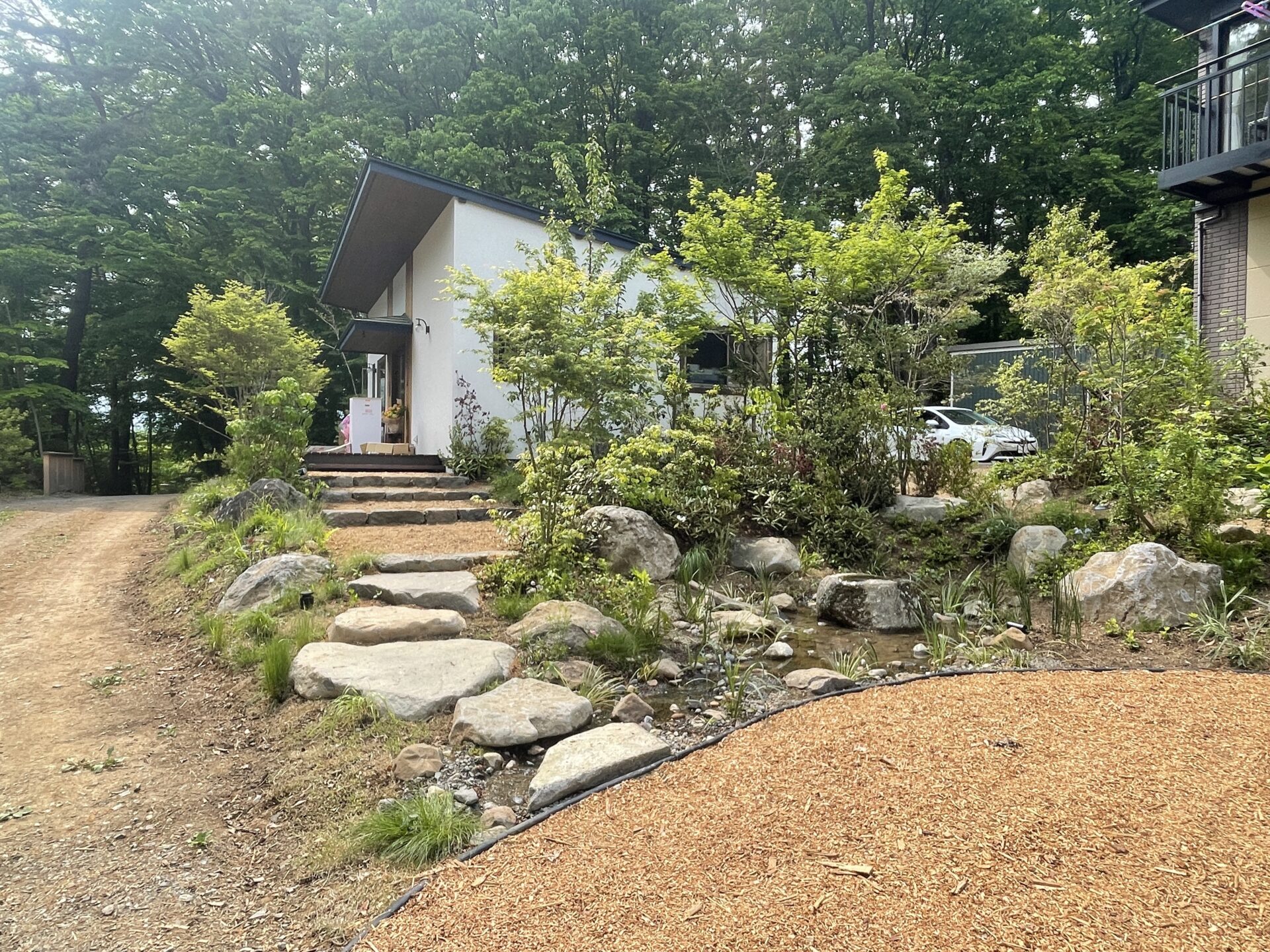 雪で閉ざされる冬から暑い夏の時期まで、豊かな水源として動植物から人まで幅広く潤いを与える空間づくりをコンセプトに作庭しました。